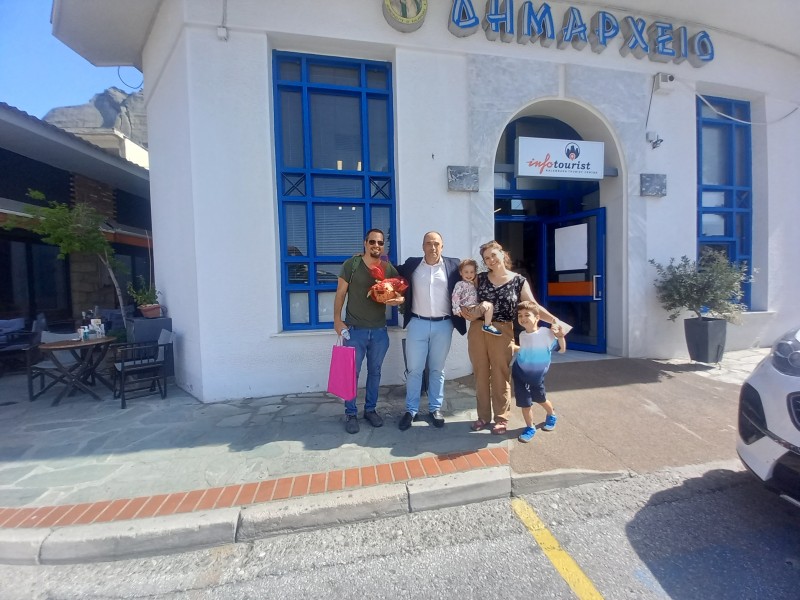 Δίχως δεύτερη σκέψη, αφουγκράζοντας τη σπουδαιότητα της παρουσίας της στα Μετέωρα, ενημέρωσα το Δήμαρχο κ. Αλέκο ο οποίος συναισθάνθηκε το πόσο σημαντικό είναι να τιμούμε τέτοιες προσωπικότητες, με τις οποίες γαλουχήθηκαν γενιές και γενιές και ακαριαία αποδέχθηκε την πρότασή μου να παραστεί στο γραφείο του. Έτσι, νωρίς το πρωί τη συνόδευσα, μαζί με την οικογένειά της στο γραφείο του Δημάρχου όπου για αρκετή ώρα και σε συγκινησιακό περιβάλλον μας διηγήθηκε κάποιες από τις πιο χαρακτηριστικές ιστορίες του θείου της.