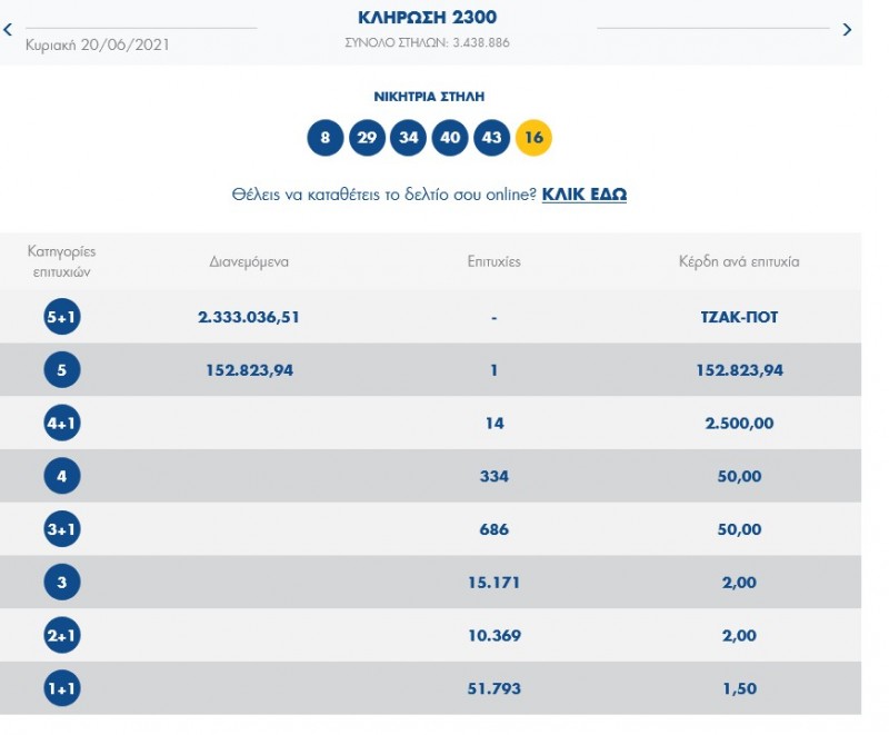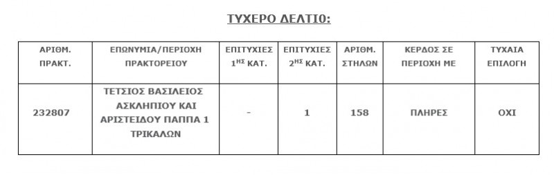 Το τυχερό δελτίο που έδωσε ένα πεντάρι με 152.823,94 παίχτηκε στο πρακτορείο του Τέτσιου Βασίλη.