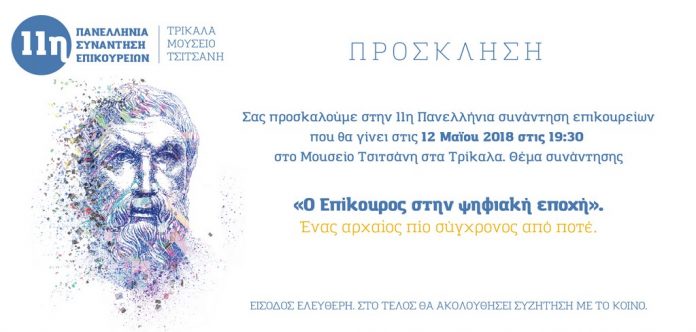 Οι Φίλοι Επικούρειας Φιλοσοφίας “Κήπος Αθηνών”, “Κήπος Θεσσαλονίκης” και “Κήπος Τρικάλων”, διοργανώνουν την 11η Πανελλήνια Συνάντηση Φίλων Επικούρειας Φιλοσοφίας, που θα πραγματοποιηθεί στις 12 Μαΐου 2018, ώρα 19:30, στα Τρίκαλα, στην Αίθουσα Μουσείου Τσιτσάνη, με θέμα: «Ο Επίκουρος στην ψηφιακή εποχή. Ένας αρχαίος πιο σύγχρονος από ποτέ».
