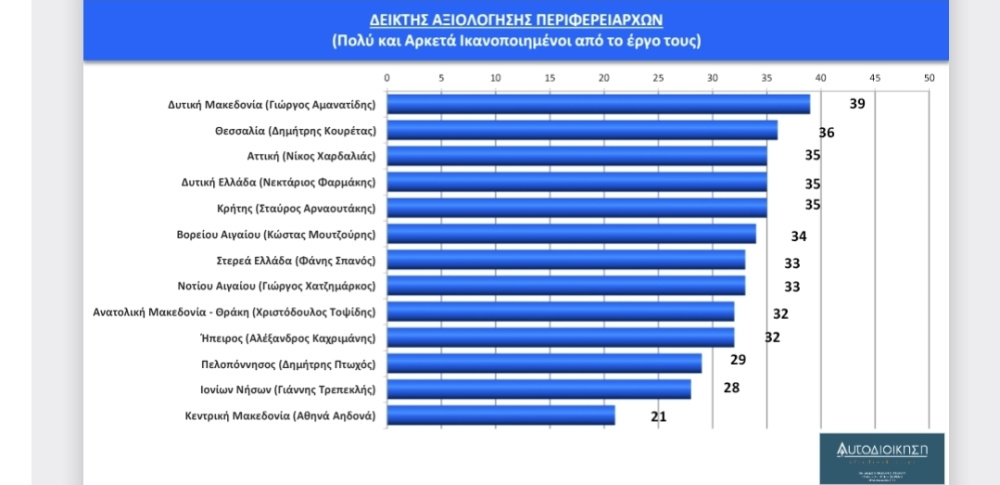Σύμφωνα με τα αποτελέσματα της, πάνω από το 34% που αποτελεί τον πανελλαδικό μέσο όρο ικανοποίησης των πολιτών από τους περιφερειάρχες («πολύ και αρκετά ικανοποιημένοι») βρίσκονται 5 από τους 13. Συγκεκριμένα:
