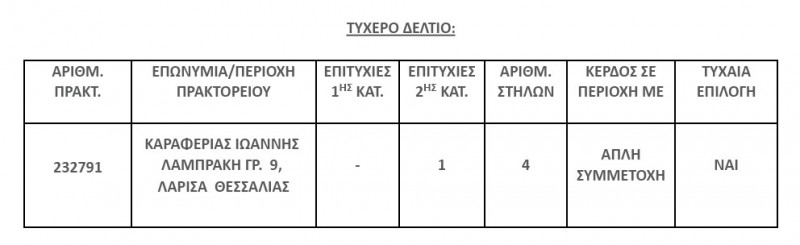 Επίσης στην δεύτερη κατηγορία (5άρια) βρέθηκε μία (1) επιτυχία, η οποία κερδίζει το ποσό των €123.453,35
