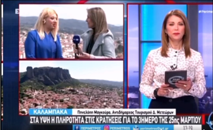 Στην εκπομπή “Περίμετρος” της ΕΡΤ3 μίλησε η αντιδήμαρχος Τουρισμού – Αθλητισμού Δήμου Μετεώρων για το τριήμερο της 25ης Μαρτίου που η πληρότητα κυμαίνεται σε υψηλά επίπεδα.