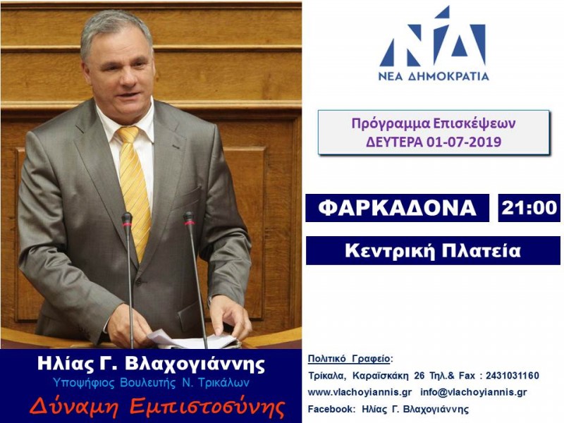 Ο Υποψήφιος Βουλευτής της Ν.Δ Νομού Τρικάλων κ. Ηλίας Βλαχογιάννης τη Δευτέρα 1 Ιουλίου θα επισκεφθεί :