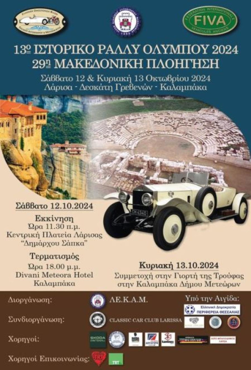 Η εκδήλωση – θεσμός της Λέσχης Κλασσικού Αυτοκινήτου Μακεδονίας 13ο Ιστορικό Rally Ολύμπου – 29η Μακεδονική Πλοήγηση θα διεξαχθεί και φέτος υπό την οργανωτική μπαγκέτα του Διοικητικού Συμβουλίου της ΛΕΚΑΜ, συνεπικουρούμενο από το Διοικητικό Συμβούλιο της Λέσχης Κλασσικού Αυτοκινήτου Λάρισας (Classic Car Club Larissa) και όπως πάντα υπό την αιγίδα των Δήμων Λάρισας, Δεσκάτης Γρεβενών και Μετεώρων – Καλαμπάκας.