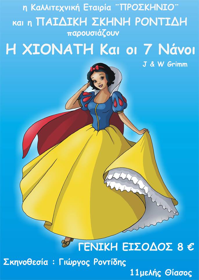 Η Καλλιτεχνική εταιρία “Προσκήνιο” και η “Παιδική σκηνή Ροντίδη” παρουσιάζουν το έργο “Η Χιονάτη και οι 7 νάνοι ” των J & W Grimm, την Κυριακή 19 Ιανουαρίου, στο Πολιτιστικό Κέντρο Καλαμπάκας, στις 17:30 το απόγευμα.