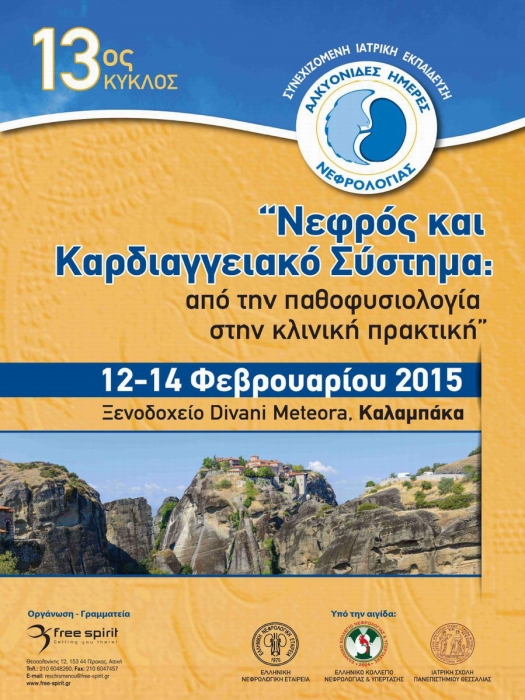 Στο πλαίσιο του ετήσιου μετεκπαιδευτικού της έργου, η Ελληνική Νεφρολογική Εταιρεία (Ε.Ν.Ε.), σε συνεργασία με το Ελληνικό Κολλέγιο Νεφρολογίας & Υπέρτασης (Ε.ΚΟ.Ν.Υ.) και την Ιατρική Σχολή του Πανεπιστημίου Θεσσαλίας, διοργανώνει το 13ο Κύκλο των Αλκυονίδων Ημερών Νεφρολογίας, με θέμα τα «Νεφρός και Καρδιαγγειακό Σύστημα: από την παθοφυσιολογία στην κλινική πρακτική», στις 12 – 14 Φεβρουαρίου 2015, στην Καλαμπάκα, στο ξενοδοχείο Divani Meteora.