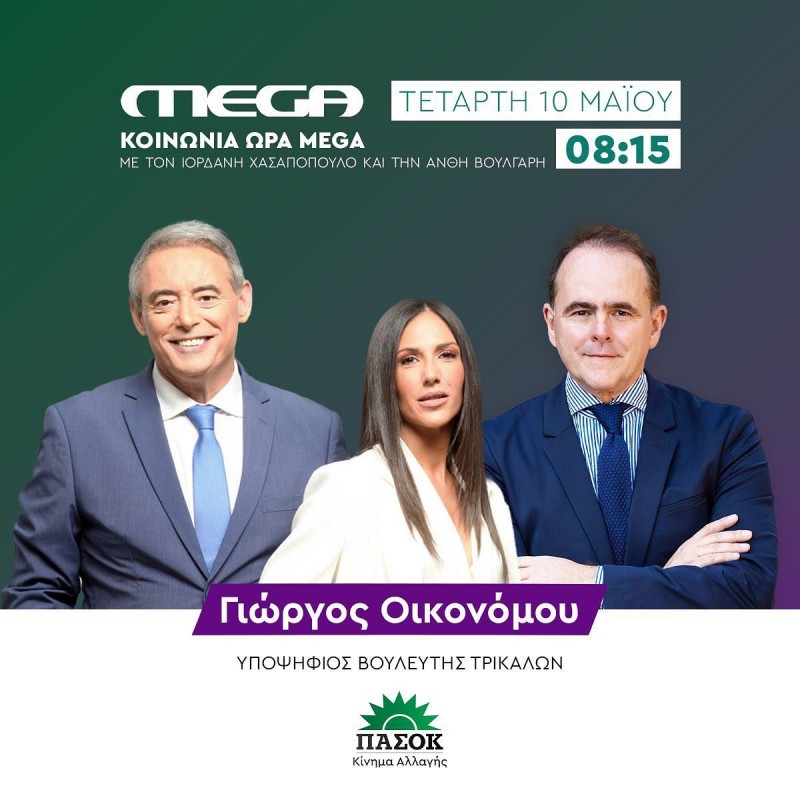 Στο MEGA και την εκπομπή ΚΟΙΝΩΝΙΑ ΩΡΑ MEGA, που παρουσιάζουν οι δημοσιογράφοι Ιορδάνης Χασαπόπουλος και Ανθή Βούλγαρη, θα μιλήσει αυριο, Τετάρτη 10 Μαιου και ώρα 08:15, o υποψήφιος βουλευτής Τρικάλων του ΠΑΣΟΚ – ΚΙΝΑΛ Γιώργος Οικονόμου.