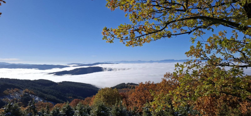 Το τοπίο μας αντάμειψε με μια καταπληκτική λιακάδα, χιόνι, λίγο αέρα και κρύο. Η θέα από την κορυφή ήταν μαγευτική, η ομίχλη απλωνόταν χαμηλά σαν μια απέραντη θάλασσα, ενώ τα έλατα ήταν ντυμένα στα λευκά. Ευκαιρία να πιάσουμε λίγο χιόνι μετά από δύο χρόνια.