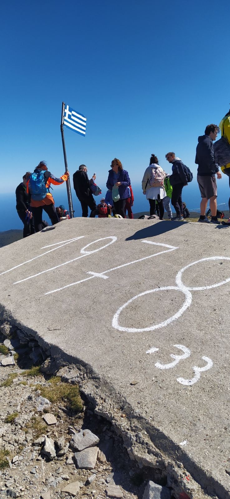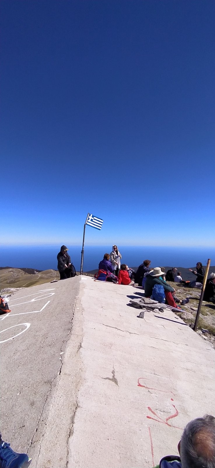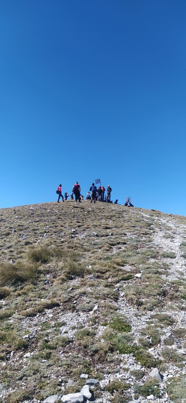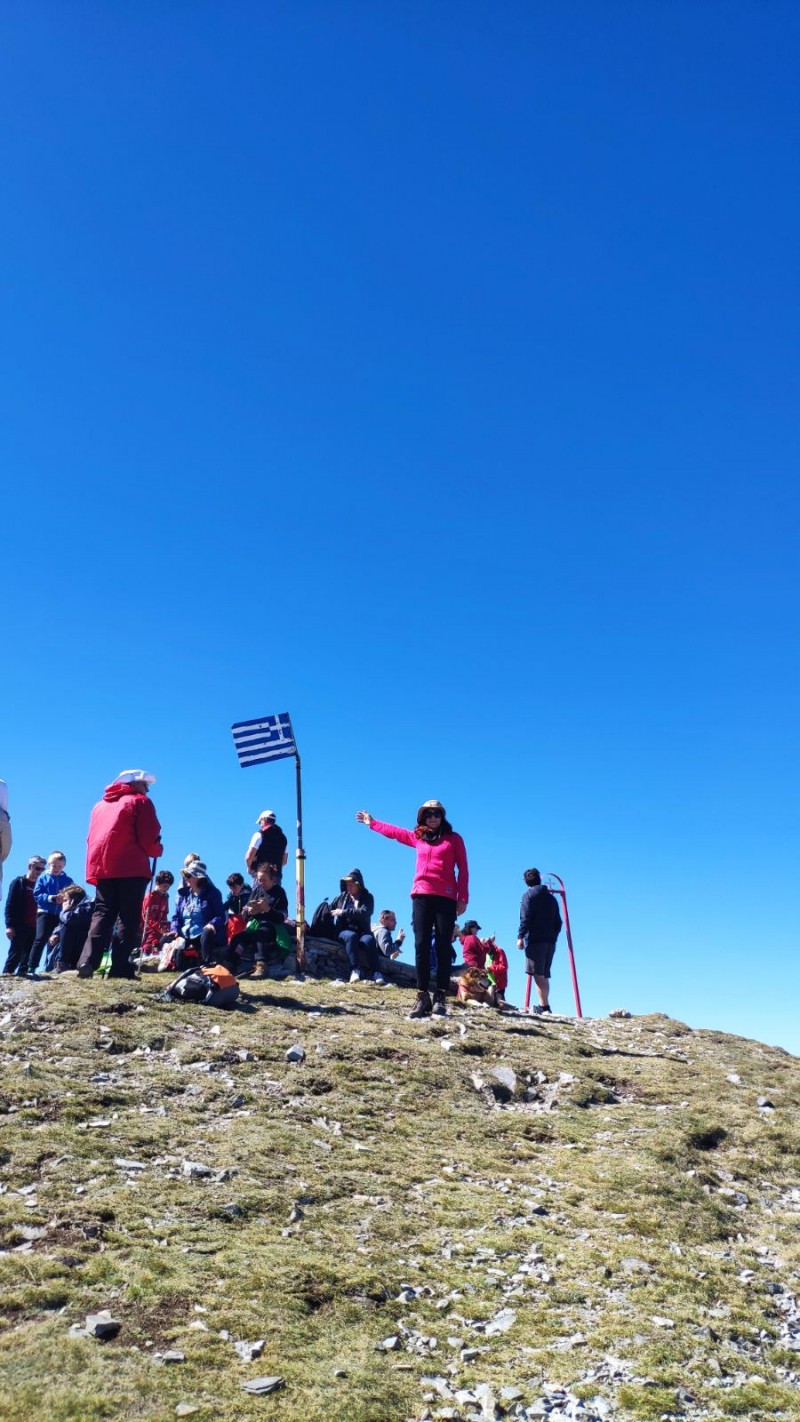 Σαράντα δύο άτομα κατέκτησαν την κορυφή ‘Αη Λιάς στα 1.978μ. Ανάμεσα τους πέντε παιδιά: Θωμάς 5 ετών, Άλκης 6 ετών, Κοσμάς, Ορφέας και Τίμος 7 ετών. Ο ευνοϊκός καιρός βοήθησε να απολαύσουμε την υπέροχη θέα όπου το μπλε της θάλασσας ακουμπούσε το γαλάζιο του ουρανού και διακρινόταν με ευκρίνεια το πρώτο πόδι της Χαλκιδικής. Στη κορυφή τα μάτια μας δε χόρταιναν το τοπίο. Ο Όλυμπος απέναντί μας μεγαλοπρεπής και πλήθος κορυφών της Πίνδου διακρινόταν περιμετρικά του θεσσαλικού κάμπου που διέσχιζε νωχελικά ο Πηνειός.