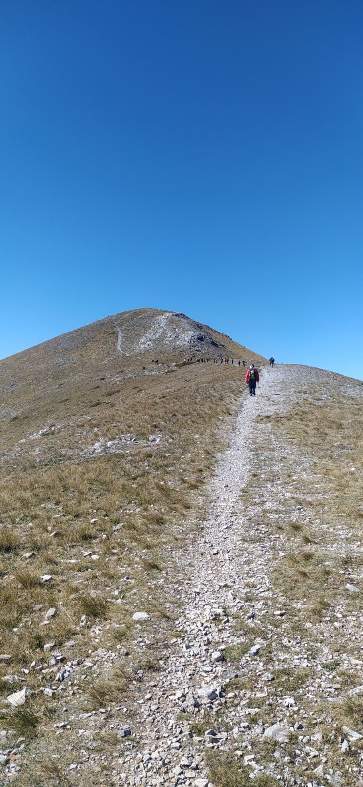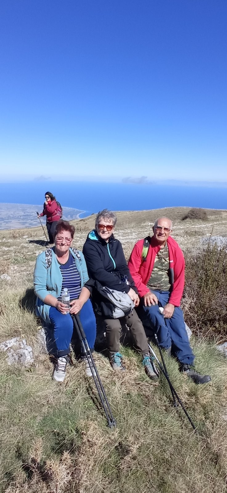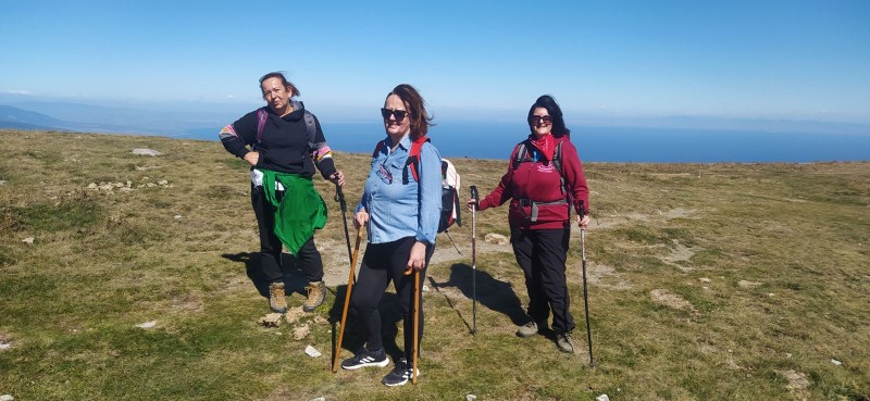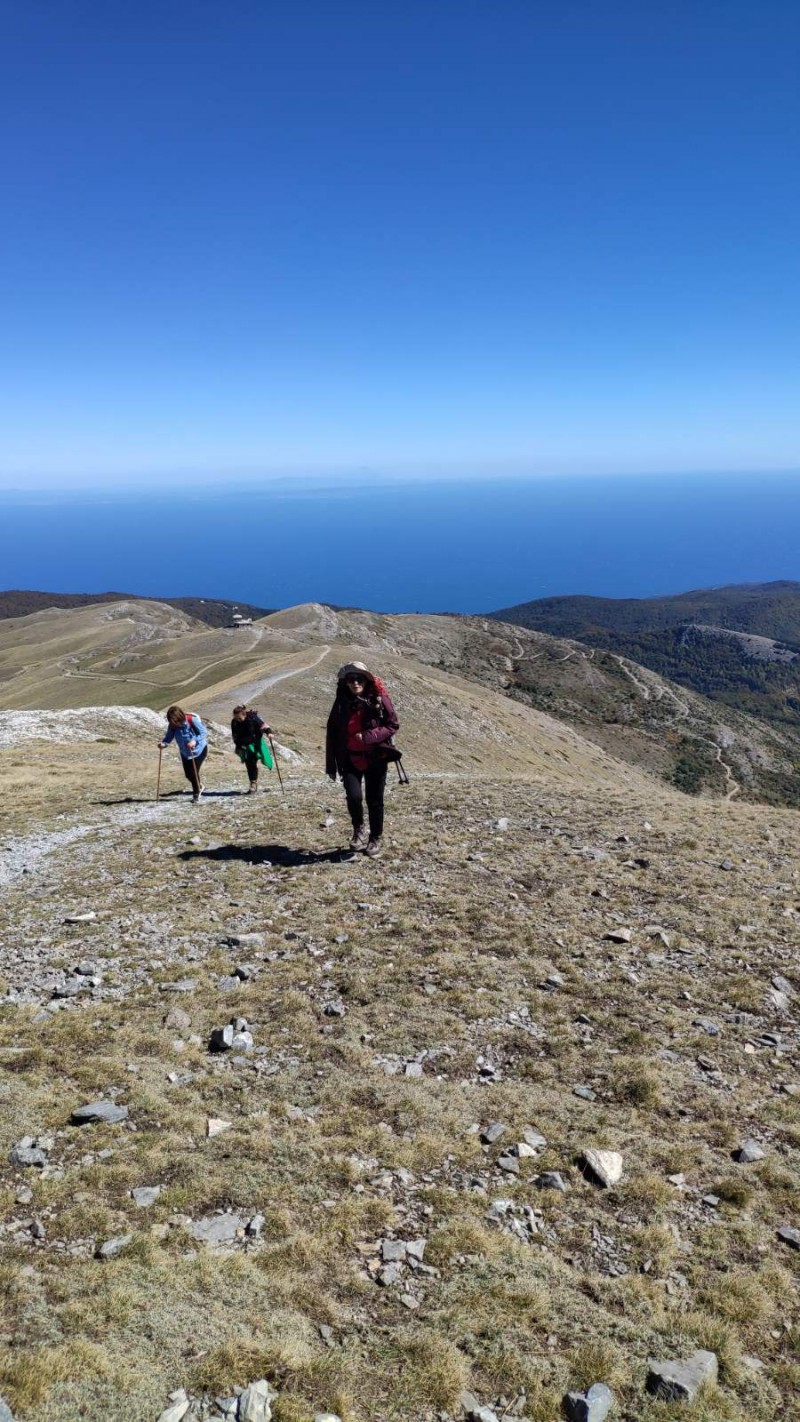 Σαράντα δύο άτομα κατέκτησαν την κορυφή ‘Αη Λιάς στα 1.978μ. Ανάμεσα τους πέντε παιδιά: Θωμάς 5 ετών, Άλκης 6 ετών, Κοσμάς, Ορφέας και Τίμος 7 ετών. Ο ευνοϊκός καιρός βοήθησε να απολαύσουμε την υπέροχη θέα όπου το μπλε της θάλασσας ακουμπούσε το γαλάζιο του ουρανού και διακρινόταν με ευκρίνεια το πρώτο πόδι της Χαλκιδικής. Στη κορυφή τα μάτια μας δε χόρταιναν το τοπίο. Ο Όλυμπος απέναντί μας μεγαλοπρεπής και πλήθος κορυφών της Πίνδου διακρινόταν περιμετρικά του θεσσαλικού κάμπου που διέσχιζε νωχελικά ο Πηνειός.