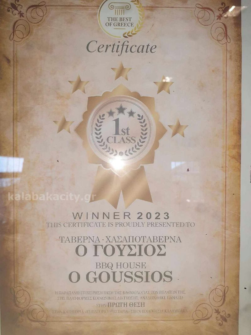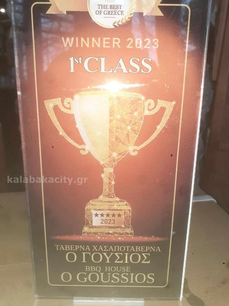 Στην θέση 1st CLASS – ΠΡΩΤΗ ΘΕΣΗ, βρέθηκε η Χασαποταβέρνα «ΓΟΥΣΙΟΣ» στον Μηλότοπο Ελαφίου Καλαμπάκας μετά από τις βαθμολογίες των πελατών στις πλατφόρμες κοινωνικής δικτύωσης για το 2023!