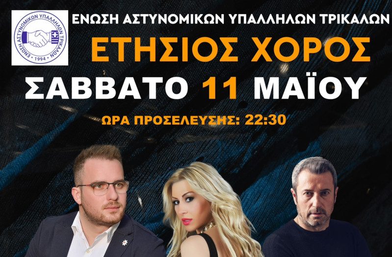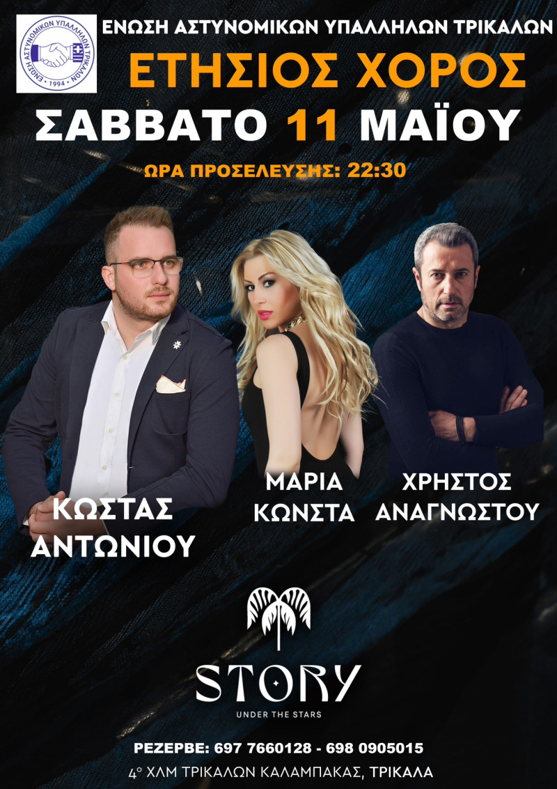 Η ΕΝΩΣΗ ΑΣΤΥΝΟΜΙΚΩΝ ΥΠΑΛΛΗΛΩΝ ΤΡΙΚΑΛΩΝ Σας προσκαλεί να τιμήσετε με την παρουσία σας, την χοροεσπερίδα μας, που θα πραγματοποιηθεί το Σάββατο 11 Μαΐου 2023 & ώρα 22:30 στο « Story under the stars», 4o χλμ. Τρικάλων – Καλαμπάκας.
