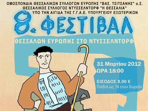 Η Ομοσπονδία Θεσσαλικών Συλλόγων Γερμανίας και άλλων κρατών Ευρώπης «ΒΑΣΙΛΗΣ ΤΣΙΤΣΑΝΗΣ» α.Σ. και ο Σύλλογος Θεσσαλών Ντύσσελντορφ «Η ΘΕΣΣΑΛΙΑ» με τη συμμετοχή των Συλλόγων-Μελών (Μονάχου, Βισμπάντεν, Ελβετία, Νυρεμβέργη, Σβάινφουρτ, Βερολίνο, Γκύτερσλο, Μπίλεφελντ και Κολωνία) διοργανώνουν το 8ο Φεστιβάλ Θεσσαλών Ευρώπης στο Ντύσσελντορφ στις 31 Μαρτίου 2012.