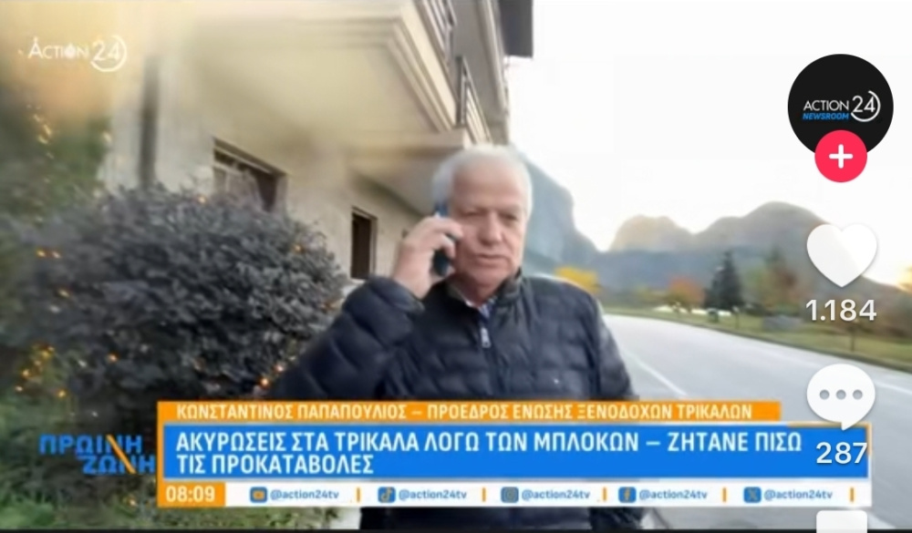 Στην πρωινή ζώνη του ACTION24 μίλησε την Τρίτη, ο Πρόεδρος της Ένωσης Ξενοδοχείων Ν. Τρικάλων κ. Κώστας Παπαπούλιος ο οποίος μίλησε για την κατάσταση όπως διαμορφώνεται στις κρατήσεις με 30% ακυρώσεις, από τα μπλόκα των αγροτών.