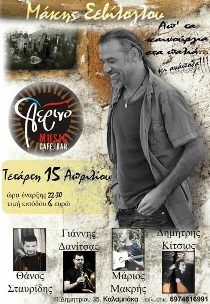 Την Τετάρτη 15 Απριλίου το βράδυ, ο Μάκης Σεβίλογλου στο μουσικό καφέ ΑΕΡΙΝΟ της Καλαμπάκας.