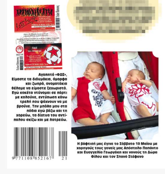 Η ιστορική εφημερίδα 60 χρόνων “Φως των Σπορ” στην πρώτη σελίδα αναφέρεται την βάπτιση των δυο παιδιών και όχι τυχαία…