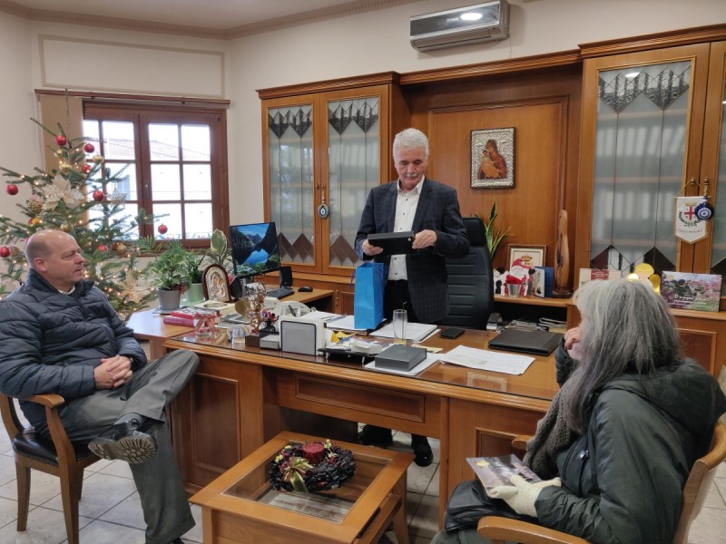 Στη συνάντηση που είχαν με τον Δήμαρχο αφού τους καλωσόρισε στον Δήμο μας τους είπε λίγα λόγια για την περιοχή και τους ευχήθηκε καλή διαμονή. Στο τέλος, οι Ακαδημαϊκοί πρόσφεραν ένα δώρο στον κ. Αλέκο με τον ίδιο να τους ευχαριστεί πολύ και να τους προσφέρει και αυτός με την σειρά του από ένα ντόπιο κρασί.
