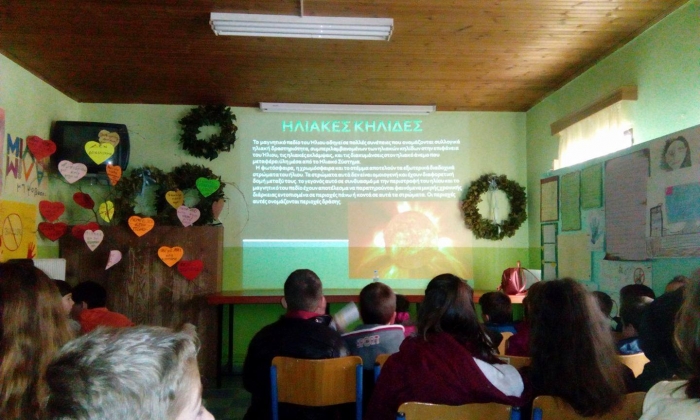 παρουσίασαν τις εργασίες τους σχετικά με τον ήλιο στους μαθητές και των δυο σχολείων και στη συνέχεια έγινε παρατήρηση του με το τηλεσκόπιο. Θα θέλαμε να συγχαρούμε και να ευχαριστήσουμε θερμά