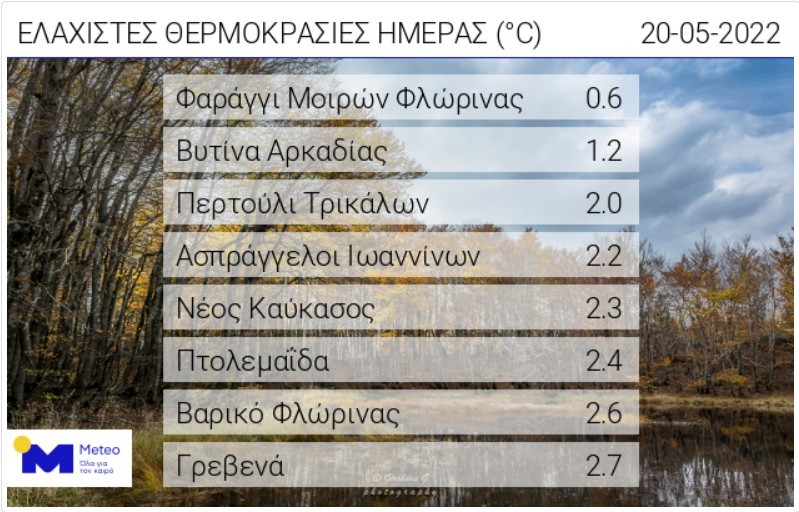 Σύμφωνα με το δίκτυο αυτόματων μετεωρολογικών σταθμών του Εθνικού Αστεροσκοπείου Αθηνών / meteo.gr, τις πρωινές ώρες της Κυριακής 08/05, ο υδράργυρος έπεσε κάτω από τους 2 βαθμούς Κελσίου. Η χαμηλότερη θερμοκρασία καταγράφηκε στο Φαράγγι Μοιρών Φλώρινας και ήταν ίση με 0.6 βαθμούς Κελσίου. Στον πίνακα που ακολουθεί παρουσιάζονται οι 8 σταθμοί που κατέγραψαν τις χαμηλότερες ελάχιστες θερμοκρασίες.