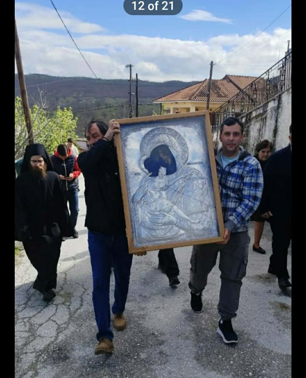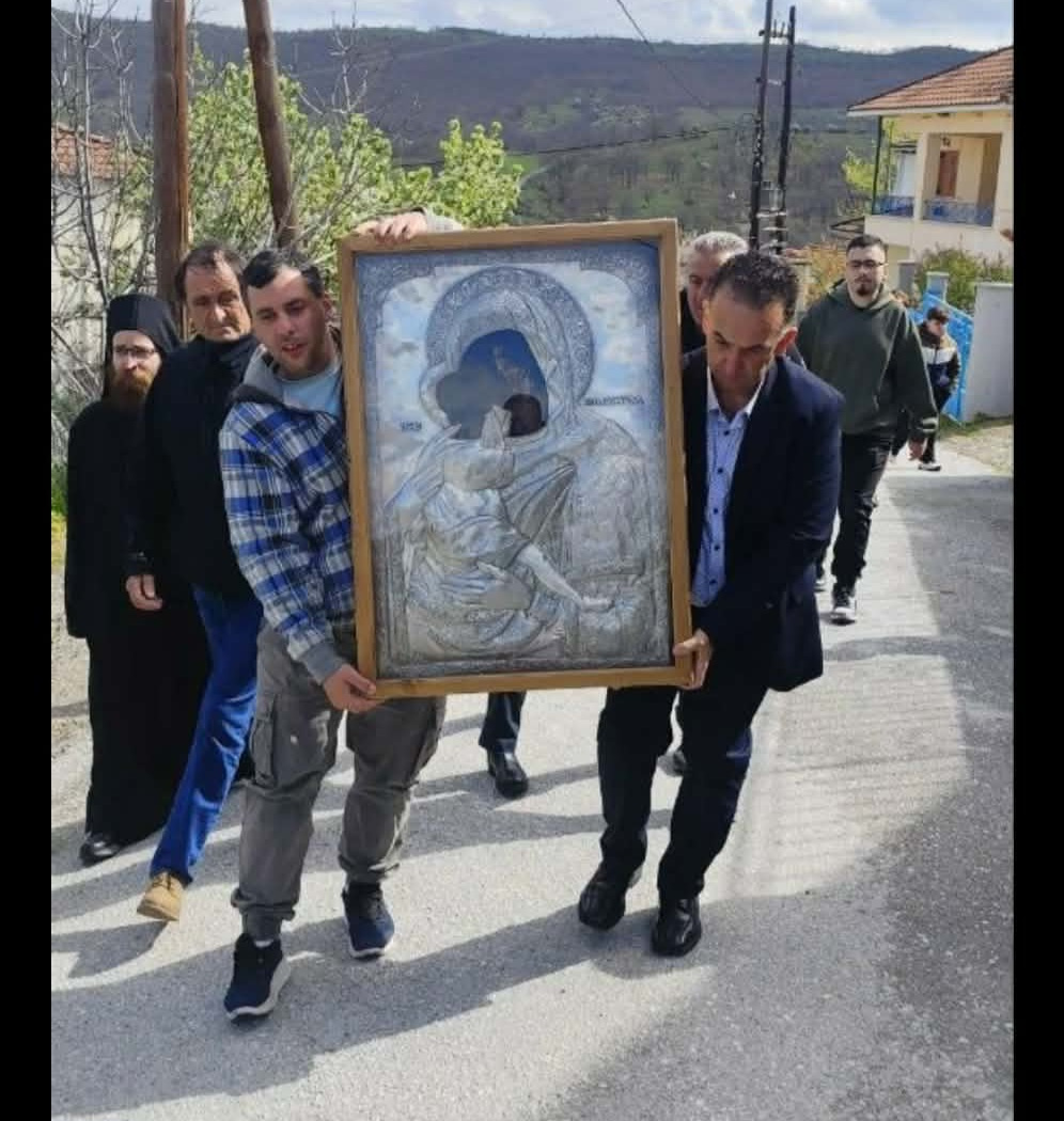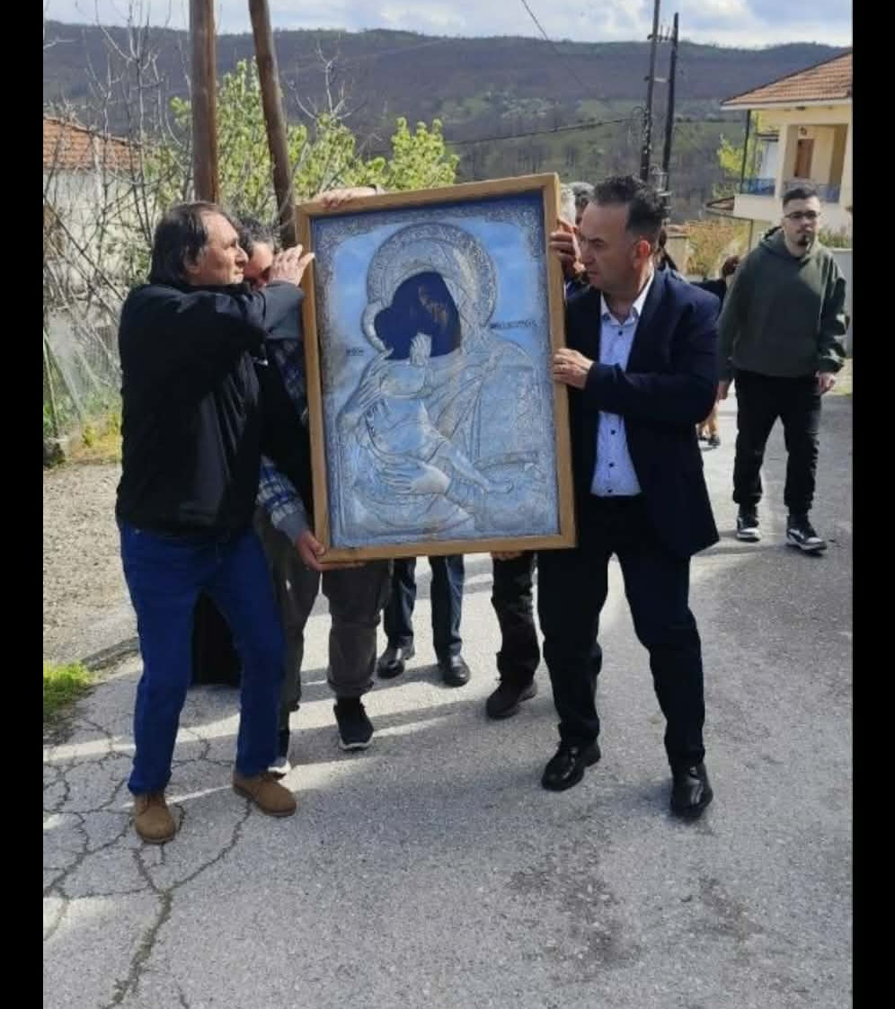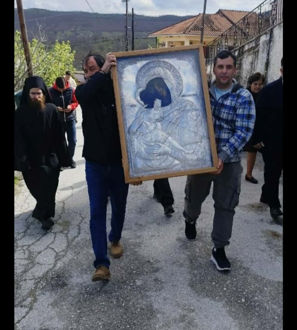Την εικόνα παρέλαβαν ο πρόεδρος και οι κάτοικοι του χωριού την οποία κατέβασαν από την Ιερά Μονή αλλάζοντας συνεχώς χέρια για να πάρουν όλοι την ευλογία της Παναγίας.