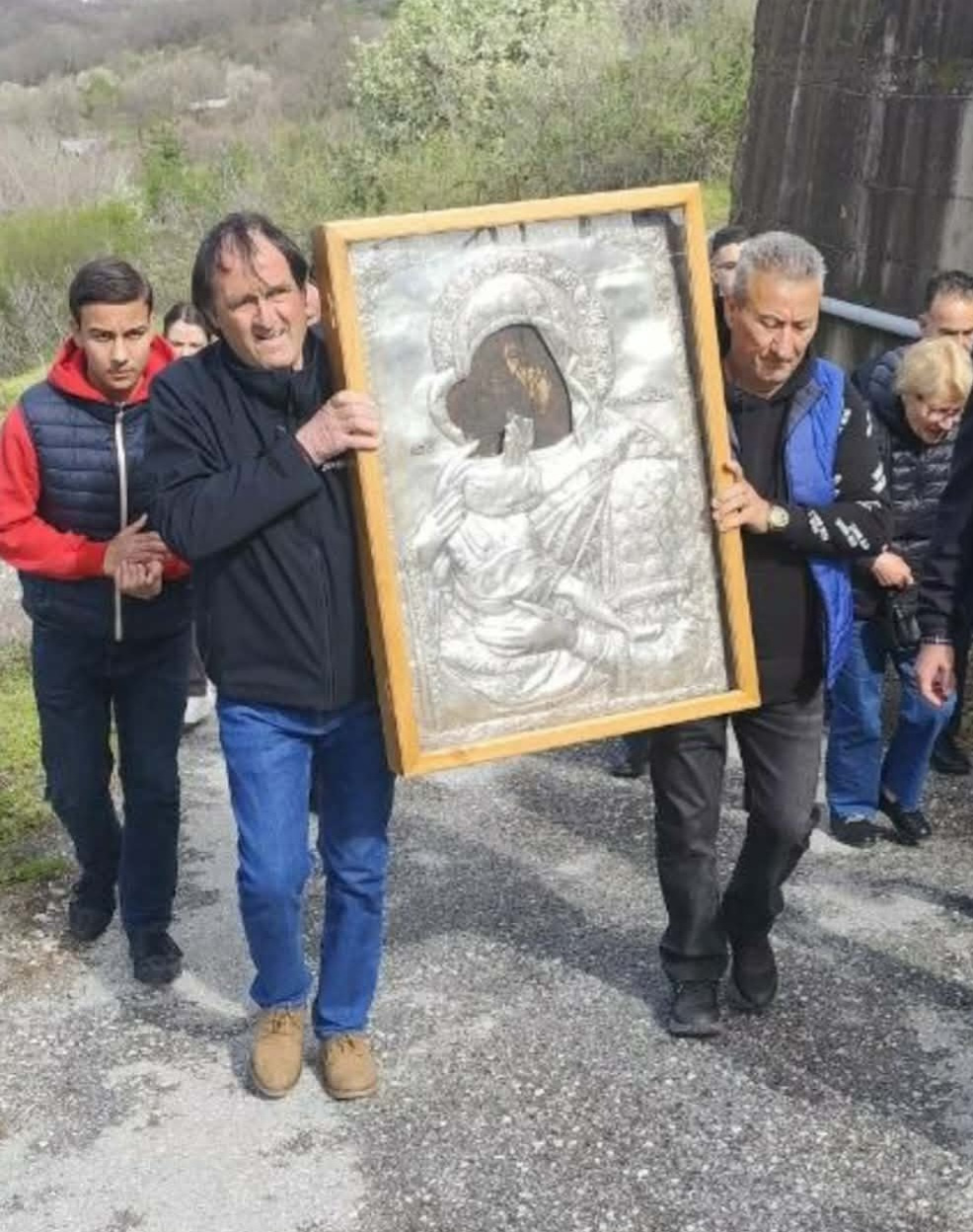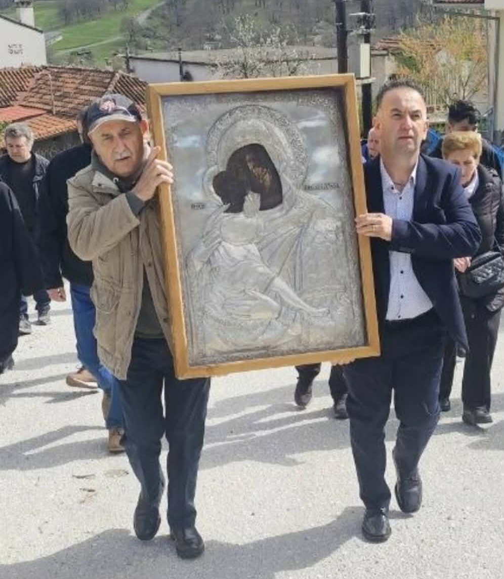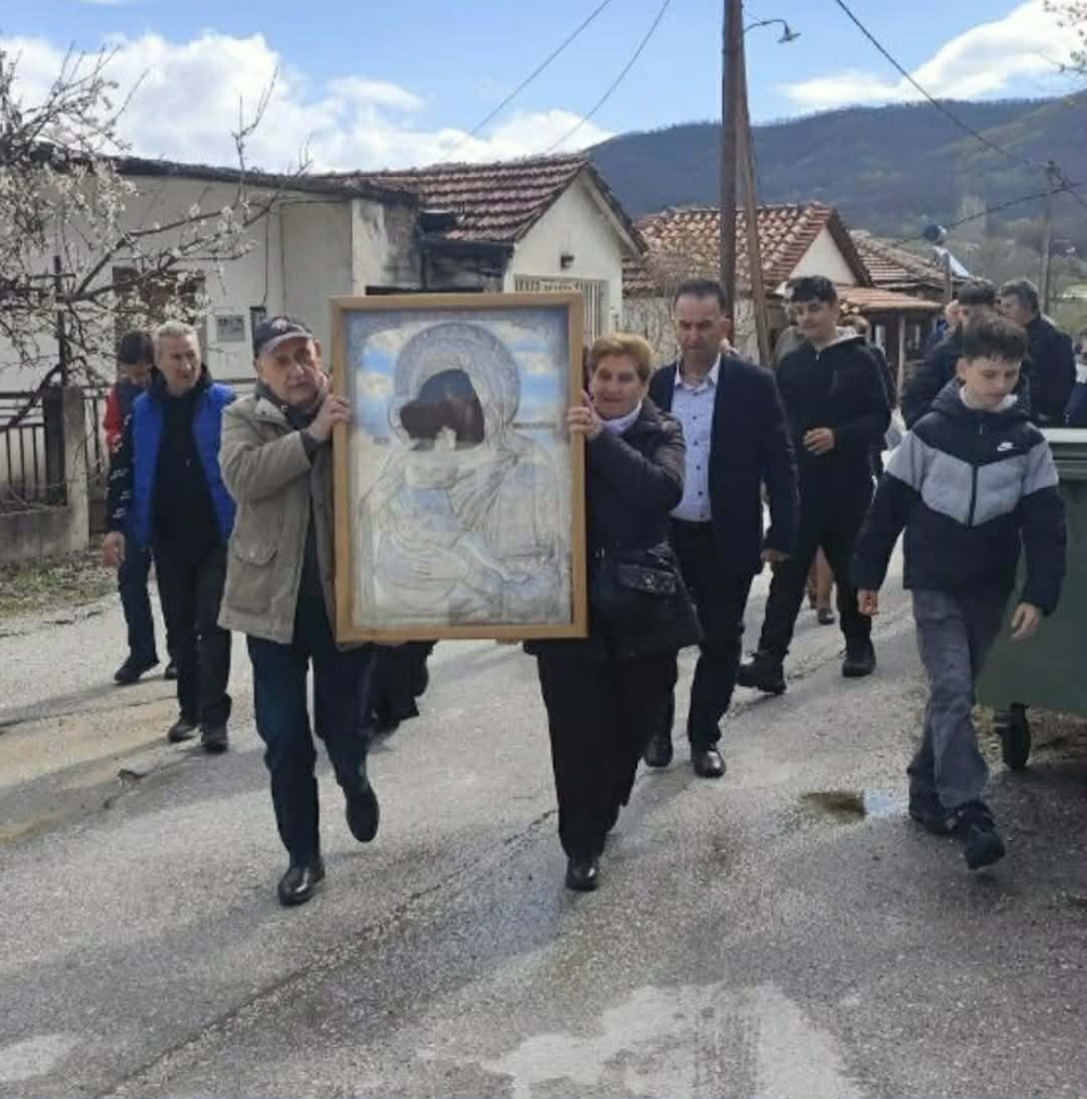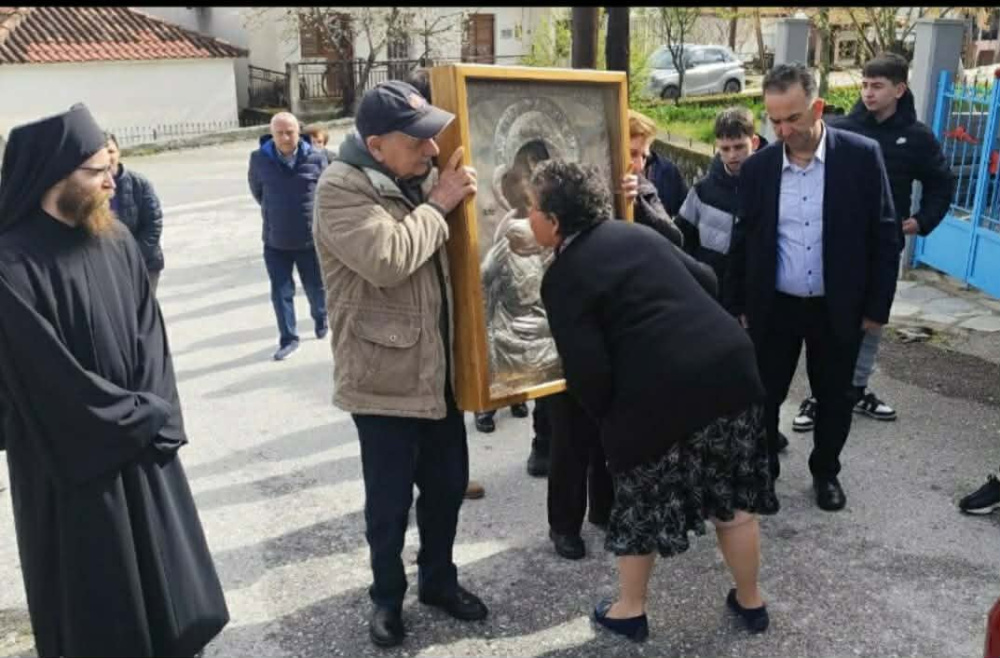 Την εικόνα παρέλαβαν ο πρόεδρος και οι κάτοικοι του χωριού την οποία κατέβασαν από την Ιερά Μονή αλλάζοντας συνεχώς χέρια για να πάρουν όλοι την ευλογία της Παναγίας.