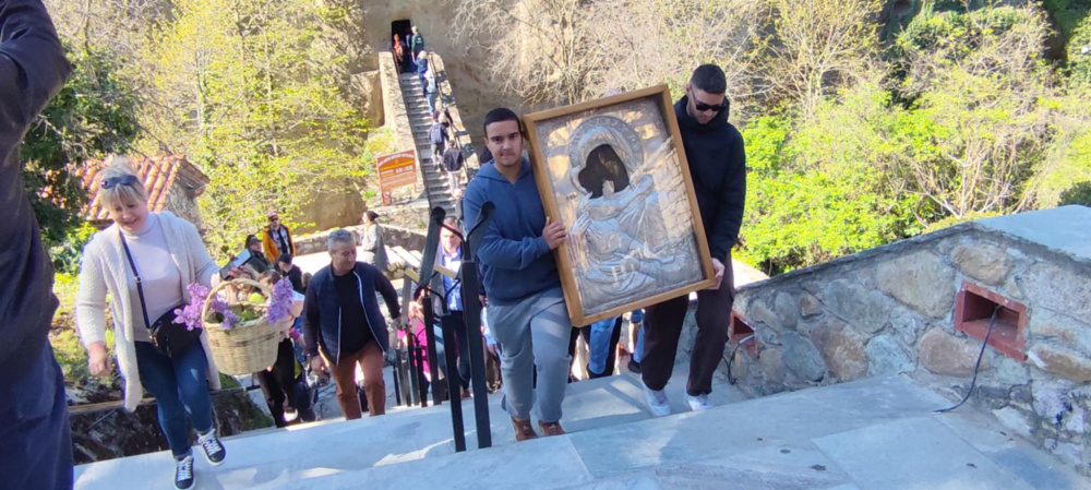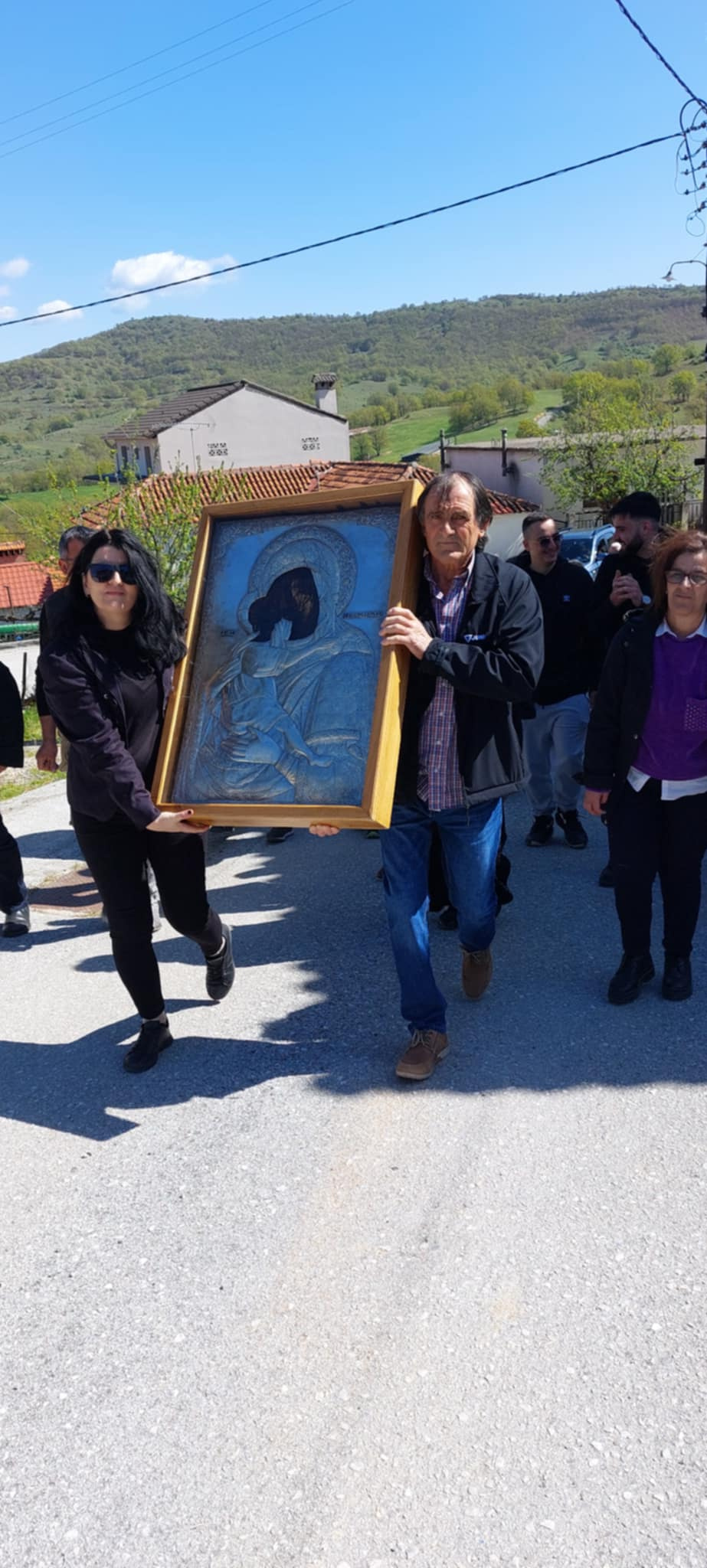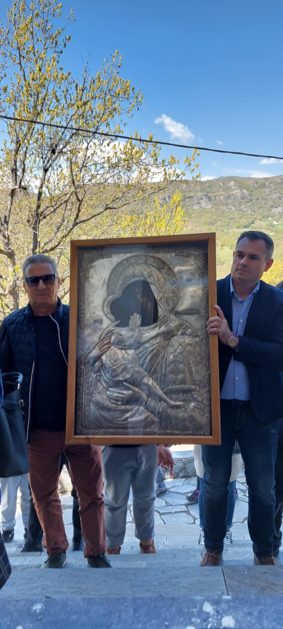 Την εικόνα παρέλαβαν ο πρόεδρος και οι κάτοικοι του χωριού την οποία κατέβασαν από την Ιερά Μονή αλλάζοντας συνεχώς χέρια για να πάρουν όλοι την ευλογία της Παναγίας.