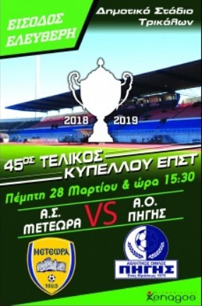 Στο Δημοτικό Στάδιο των Τρικάλων διεξαχθεί την Πέμπτη 28 Μαρτίου 2019 στις 15:30, σύμφωνα με επίσημη ανακοίνωση της ΕΠΣ Τρικάλων ο 45ος τελικός κυπέλλου μεταξύ των ομάδων Α.Σ Μετέωρα – Α.Ο. Πηγής.