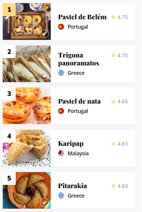 Στο Top 5 έχουμε ακόμα μία ελληνική επιτυχία. Είναι τα Πιταράκια ή αλλιώς Πλακόπιτες της Μήλου. Και αυτά ισοβαθμούν με 4,63 / 5. Είναι μία νησιωτική συνταγή για τυροπιτάκια από παραδοσιακό φύλλο σε σχήμα μισοφέγγαρου γεμισμένα με Μηλέικο τυρί. Η ζύμη είναι πάρα πολύ απλή και φτιάχνεται με αλεύρι, ελάχιστο ελαιόλαδο, ξύδι ή χυμό λεμονιού, αλάτι και χλιαρό νερό. Η γέμιση αποτελείται από τριμμένο ντόπιο τυρί με φρεσκοτριμμένο πιπέρι.