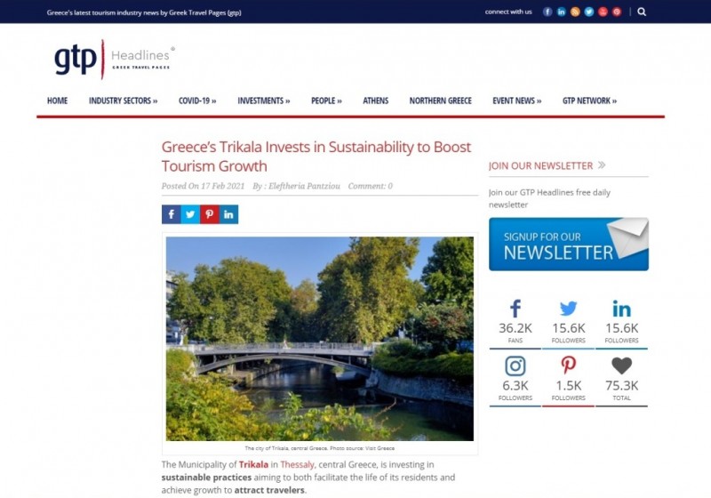 Ετσι στο δημοσίευμα (στη διεύθυνση https://news.gtp.gr/2021/02/17/greeces-trikala-invests-sustainability-boost-tourism-growth/) γίνονται αναφορές:
