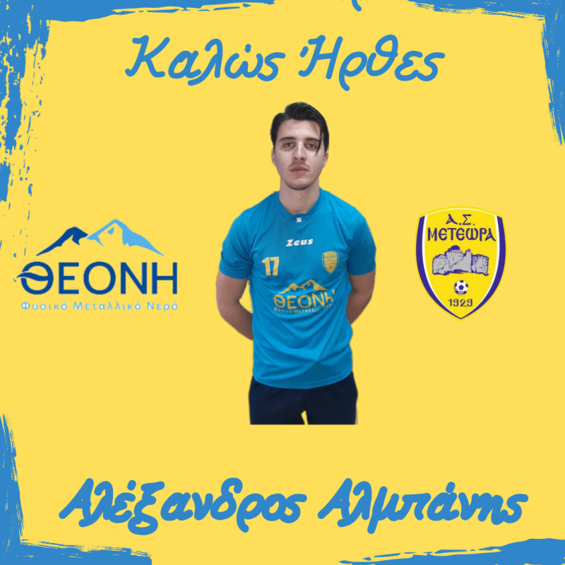 Ο ΑΣ Μετέωρα ανακοινώνει με μεγάλη χαρά την απόκτηση του μεσοεπιθετικού Αλέξανδρου Αλμπάνη ο οποίος αγωνίζονταν στον Διγενή Νεοχωρίου κι έχει αγωνιστεί στο παρελθόν τόσο στα τμήματα της Ακαδημίας όσο και της Ανδρικής μας ομάδας.
