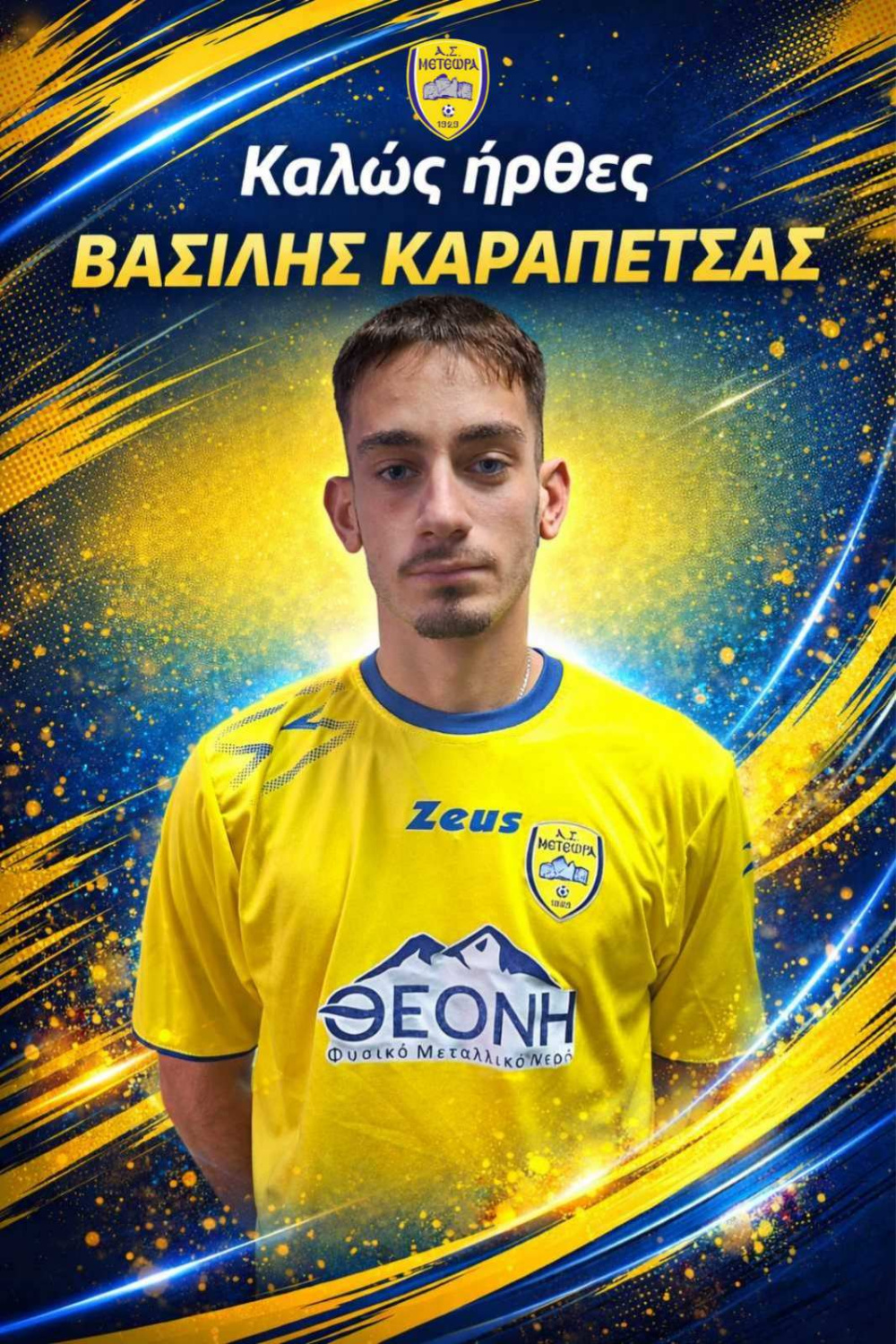 Ο ΑΣ Μετέωρα ανακοινώνει με μεγάλη χαρά την μεταγραφή του 17χρονου Καλαμπακιώτη ποδοσφαιριστή Βασίλη Καραπέτσα ο οποίος αγωνίζεται ως πλάγιος επιθετικός και μέχρι πρότινος ήταν στον Εθνικό Βράχο Καστρακίου.