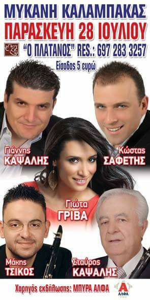 Στον «Πλάτανο» στη Μύκανη απόψε ο Γιάννης Καψάλης, η Γιώτα Γρίβα και ο Κώστας Σαφέτης