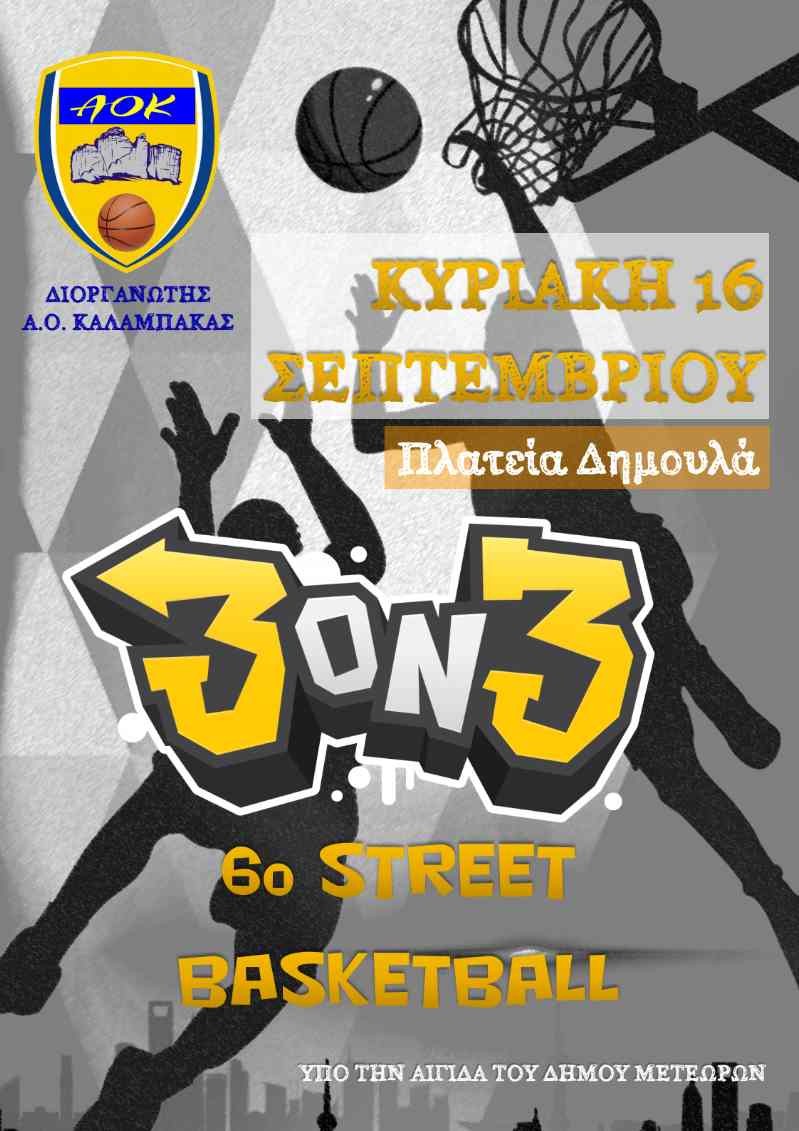 Ο Α.Ο. Καλαμπάκας, όπως κάθε χρόνο, έτσι και φέτος, με στόχο και σκοπό την καλλιέργεια της αθλητικής παιδείας, διοργανώνει στην πόλη μας -για έκτη χρονιά- το Street Basketball 3on3, το οποίο θα διεξαχθεί την Κυριακή 16 Σεπτεμβρίου 2018 (11:00-13:00) στην πλατεία Δημουλά.
