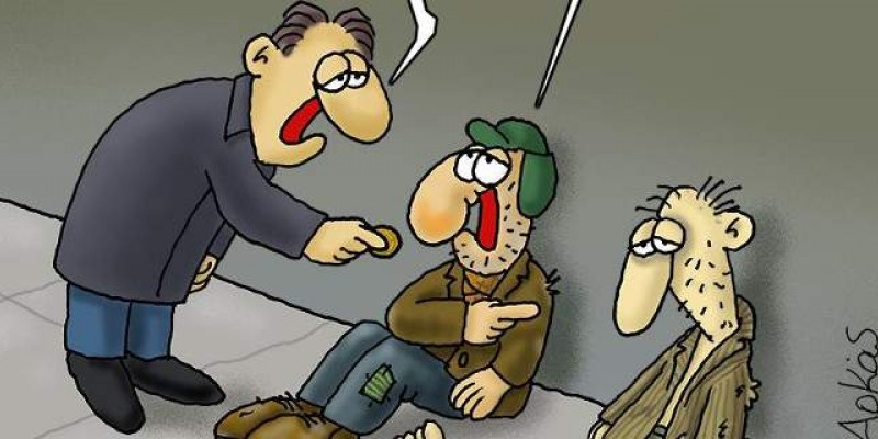 Παρουσιάζοντας δυο συνταξιούχους να κάθονται στο δρόμο και έναν κύριο να τους πλησιάζει δίνοντας μόνο στον ένα να φάει, διεξάγεται ο παρακάτω διάλογος: «Πάρε φτωχέ μου άνθρωπε να κάνεις Χριστούγεννα» με τον συνταξιούχο να διερωτάται : «Αυτός;» και τον άγνωστο να του απαντάει: «Αυτός αποκλείεται να επιβιώσει μέχρι τις εκλογές».