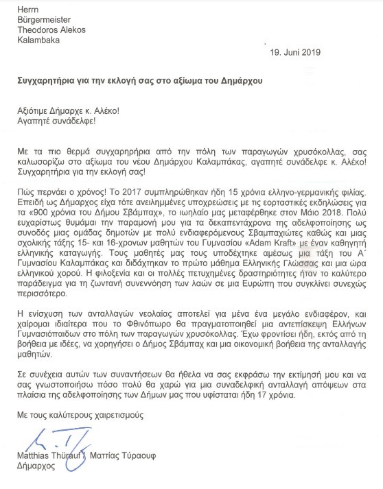 Συγχαρητήρια επιστολή στο νέο Δήμαρχο Μετεώρων Θοδωρή Αλέκο από τον Δήμαρχο του Σβάμπαχ Ματτίας Τυράουφ Διάφορα Από admin Δημοσίευση Ιούλ 4, 2019 -19:19 0 963 Κοινοποίηση FacebookTwitterΗλεκτρονικό ΤαχυδρομείοViber Συγχαρητήρια επιστολή έστειλε στο νέο Δήμαρχο Μετεώρων Θοδωρή Αλέκο, ο Δήμαρχος Σβάμπαχ Ματτίας Τυράουφ. 0 963 Κοινοποίηση