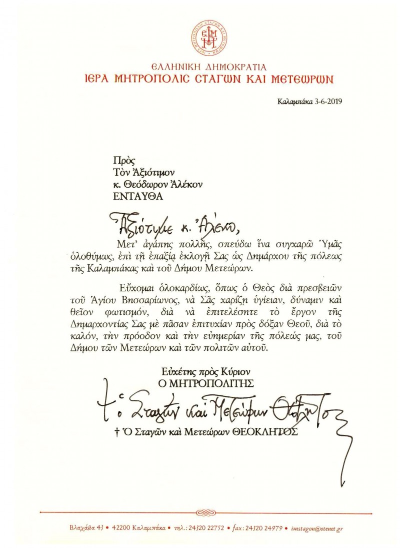 Συγχαρητήρια επιστολή στον νέο Δήμαρχο Δήμου Μετεώρων Θοδωρή Αλέκο απέστειλε ο Μητροπολίτης Σταγών και Μετεώρων κ. Θεόκλητος.