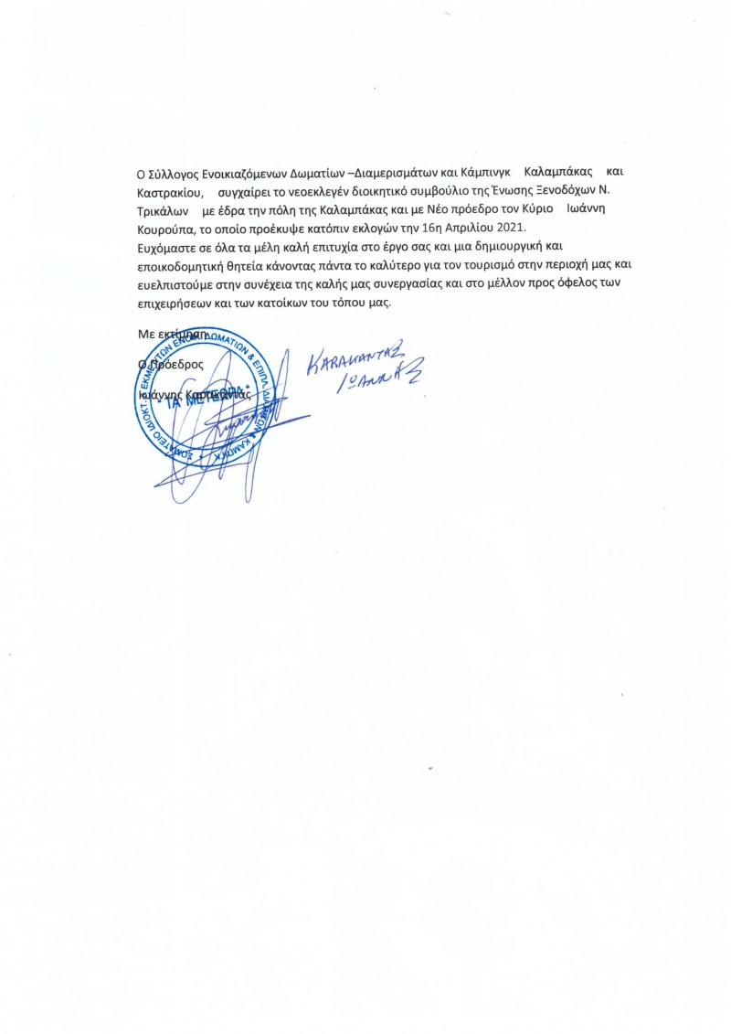 Ο Σύλλογος Ενοικιαζομένων Δωματίων – Διαμερισμάτων και Κάμπινγκ Καλαμπάκας και Καστρακίου , συγχαίρει το νεοεκλεγέν συμβούλιο της Ένωσης Ξενοδόχων Ν. Τρικάλων με έδρα την Καλαμπάκα και με νέο πρόεδρο τον κ. Κουρούπα Ιωάννη το οποίο προέκυψε κατόπιν εκλογών την 16η Απριλίου 2021.