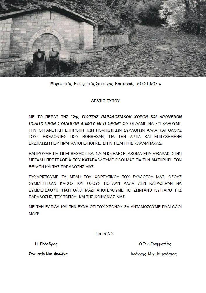 Συγχαρητήριο – Ευχαριστήριο του Μορφωτικού Ευεργετικού Συλλόγου Καστανιάς « Ο ΣΤΙΝΟΣ » Ανακοινώσεις Από admin Δημοσίευση Σεπ 3, 2018 -21:50 0 609 Κοινοποίηση FacebookTwitterΗλεκτρονικό ΤαχυδρομείοViber Το παρακάτω δελτίο τύπου έστειλε ο ΜΕΣ Καστανιάς το οποίο αναφέρεται στην 2η Γιορτή Παραδοσιακών Χορών και Δρώμενων Πολιτιστικών Συλλόγων του Δήμου Μετεώρων όπου συμμετείχε. 0 609 Κοινοποίηση