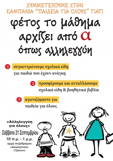 Το δίκτυο ”αλληλεγγύη για όλους”, που αρκετοί συμπολίτες μας έχουν γνωρίσει από τις δράσεις με τα προϊόντα ‘χωρίς μεσάζοντες’ συμμετέχει στην καμπάνια με σύνθημα “παιδεία για όλους”