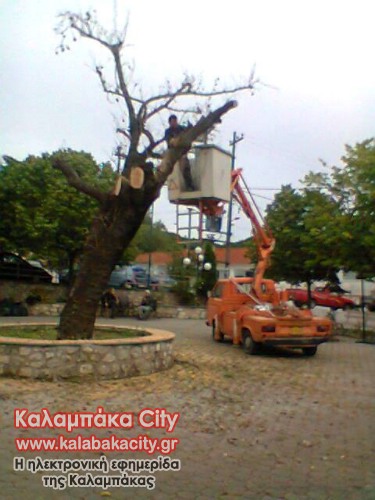 Ο πλάτανος που είχε αρχίσει να ξεραίνεται κόπηκε σήμερα από συνεργείο του Δήμου Καλαμπάκας προκειμένου να απομακρυνθεί και μετά από κατάλληλες εργασίες να φυτευεί νέο δέντρο στην θέση του.