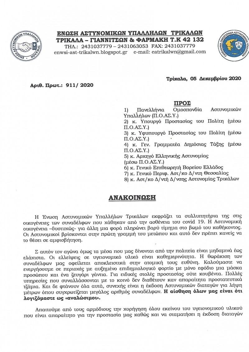 Συλλυπητήρια της Ένωσης Αστυνομικών Υπαλλήλων Τρικάλων στις οικογένειες των συναδέλφων που έφυγαν από COVID -19