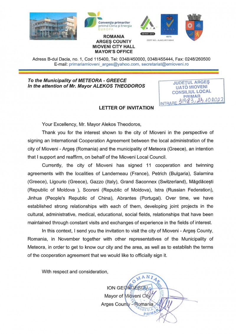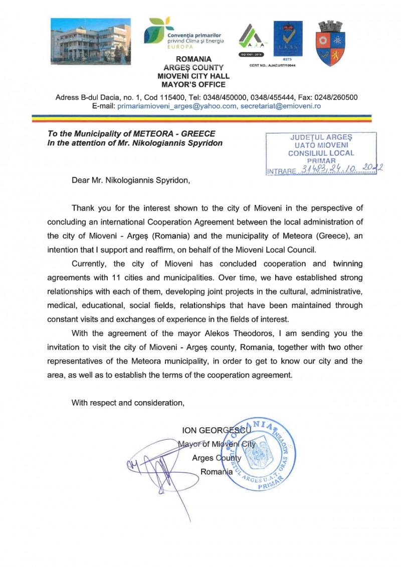 Έπειτα από επαφές του κ. Νικολογιάννη με επιχειρηματίες και σεβαστές προσωπικότητες που επισκέπτονται συχνά το Δήμο Μετεώρων αλλά και επισκέψεις στη χώρα της Ρουμανίας με συμμετοχή στην έκθεση τουρισμού ROMEXPO και τηλεοπτικές παρουσιάσεις με στόχο την προβολή και προώθηση του δήμου σε μία χώρα που κατέχει την πρώτη θέση στον οδικό τουρισμό, ο Δήμαρχος του Mioveni έστειλε επίσημο αίτημα και πρόσκληση για τη συνεργασία μεταξύ των δύο δήμων.