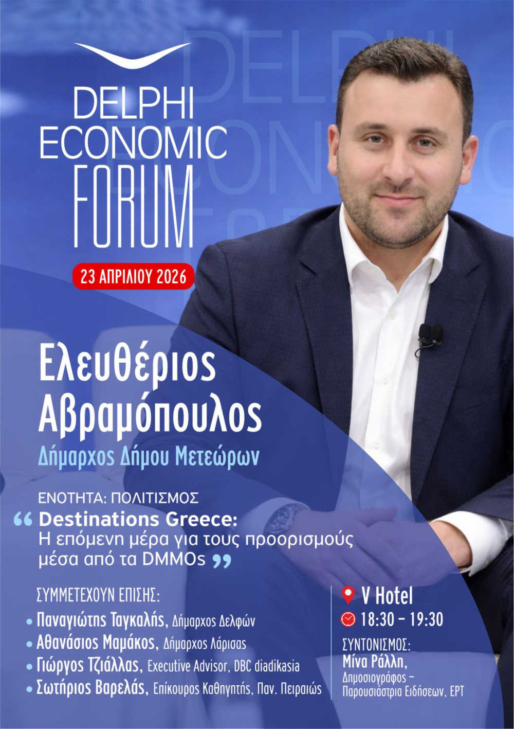 Ο Δήμαρχος Μετεώρων, Λευτέρης Αβραμόπουλος, συμμετέχει στο Οικονομικό Φόρουμ των Δελφών, έναν από τους σημαντικότερους θεσμούς διαλόγου για την οικονομία, την πολιτική και την ανάπτυξη στην Ελλάδα και διεθνώς. Στο πλαίσιο των εργασιών του Φόρουμ, ο κ. Αβραμόπουλος θα λάβει μέρος στη θεματική συζήτηση με τίτλο «Destinations Greece: The next-day challenge for destinations through DMMOs», η οποία θα πραγματοποιηθεί την Πέμπτη 23 Απριλίου, στις 18:30, στους Δελφούς.