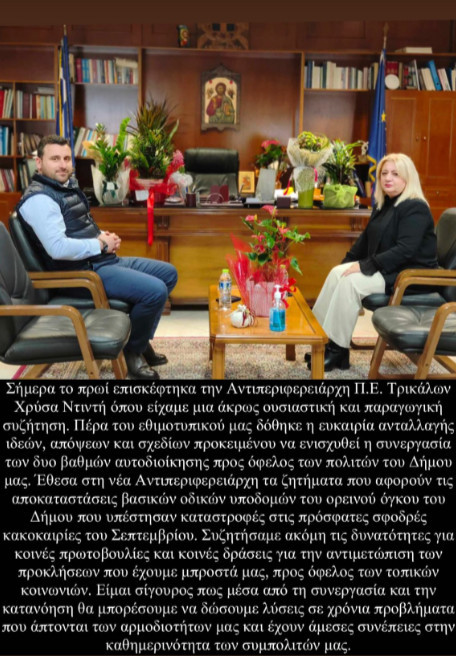 Σήμερα το πρωί επισκέφτηκα την Αντιπεριφερειάρχη Π.Ε. Τρικάλων Χρύσα Ντιντή όπου είχαμε μια άκρως ουσιαστική και παραγωγική συζήτηση.