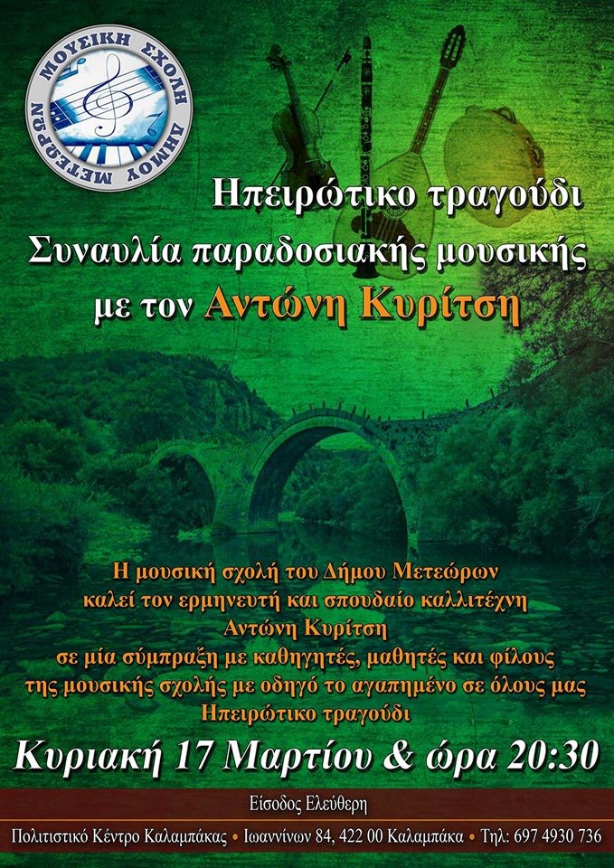Συναυλία με τον τραγουδιστή του Δημοτικού Τραγουδιού Αντώνη Κυρίτση στην Καλαμπάκα από την Μουσική Σχολή