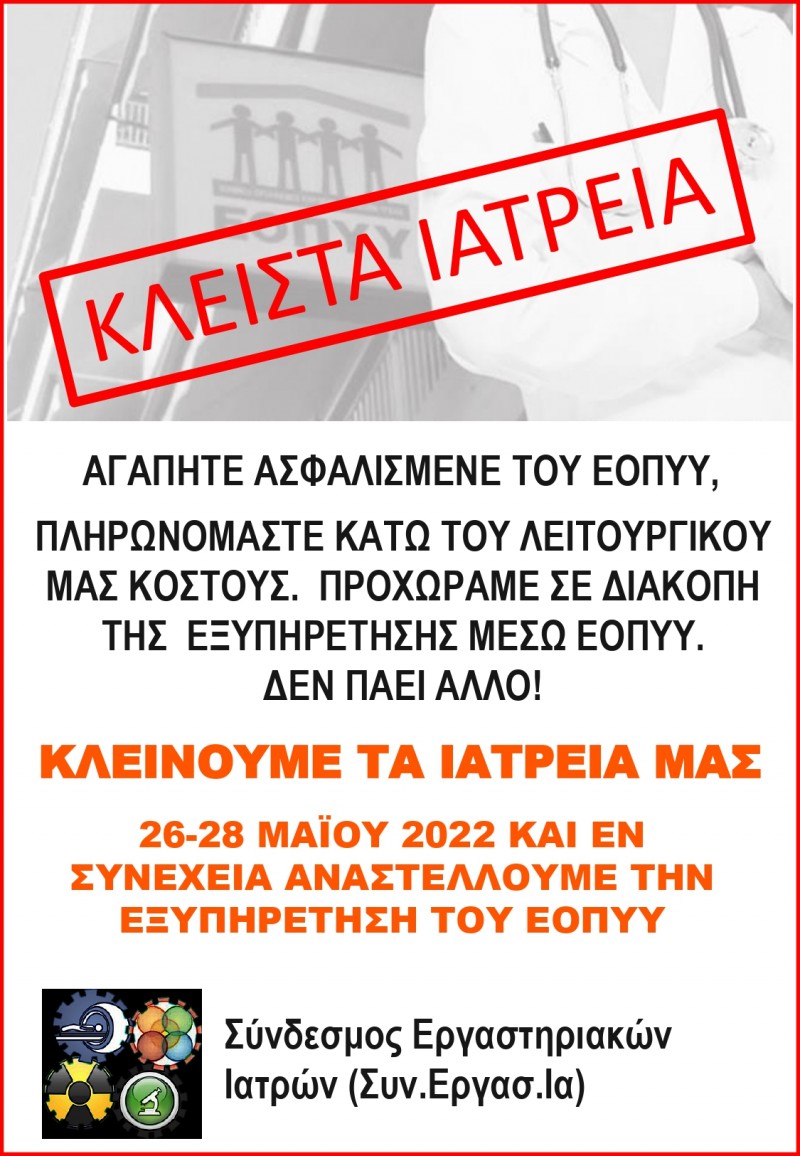 Σύνδεσμος Εργαστηριακών Ιατρών – Κλείνουμε τα ιατρεία μας 26 – 28 Μαΐου και αναστέλλεται η εξυπηρέτηση του ΕΟΠΥΥ