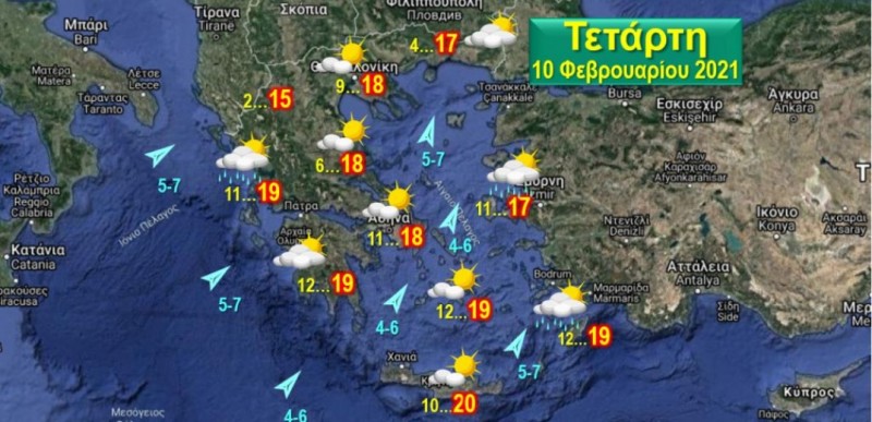Τετάρτη, 10-2-2021 Βελτίωση με ηλιοφάνεια στις περισσότερες περιοχές. Εξαίρεση με συννεφιά και λίγες βροχές έως τις πρωινές ώρες τα νησιά του ανατολικού Αιγαίου και τα Δωδεκάνησα και το μεσημέρι συννεφιά με λίγες βροχές στην Ήπειρο και τη δυτική Στερεά. Αυξημένη αφρικανική σκόνη, περιορισμένη ορατότητα και τοπικές ομίχλες τη νύχτα και το πρωί.