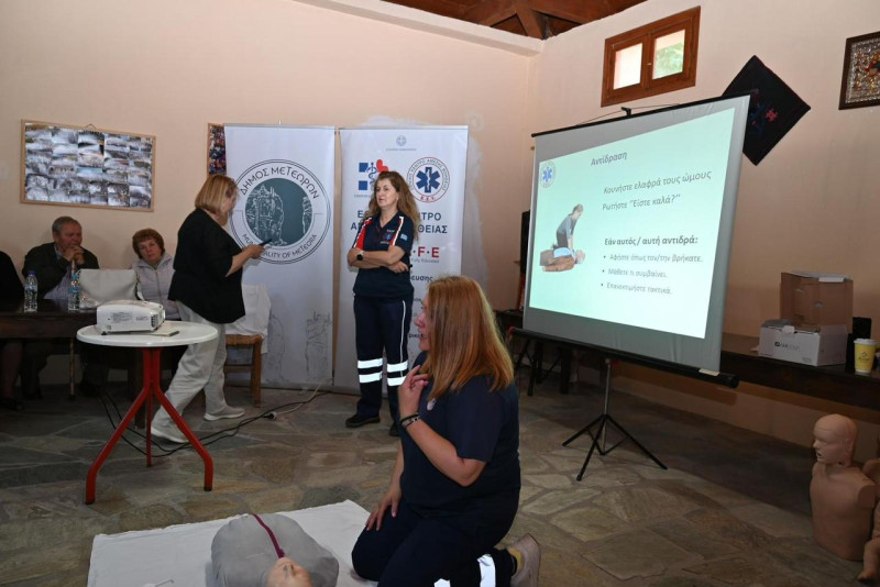 Συνεχίζεται από το Δήμο Μετεώρων η συνεργασία με το ΕΚΑΒ για το πρότυπο πρόγραμμα εκπαίδευσης πολιτών σε χωριά του ορεινού όγκου στην παροχή πρώτων βοηθειών, καρδιοαναπνευστικής αναζωογόνησης (ΚΑΡΠΑ) και χρήσης αυτόματου εξωτερικού απινιδωτή.
