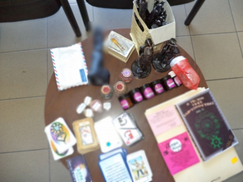 • πλήθος αντικειμένων σχετικών με τη δραστηριότητα της (κέρινα ομοιώματα ανθρώπων, τράπουλες μαντείας – αστρολογίας, βαζάκια που περιείχαν διάφορα φίλτρα και αρώματα κ.α.)