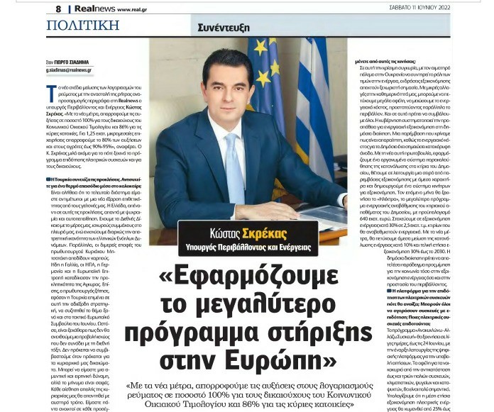 Συνέντευξη του Υπουργού Περιβάλλοντος και Ενέργειας, Κώστα Σκρέκα, στην εφημερίδα Real News